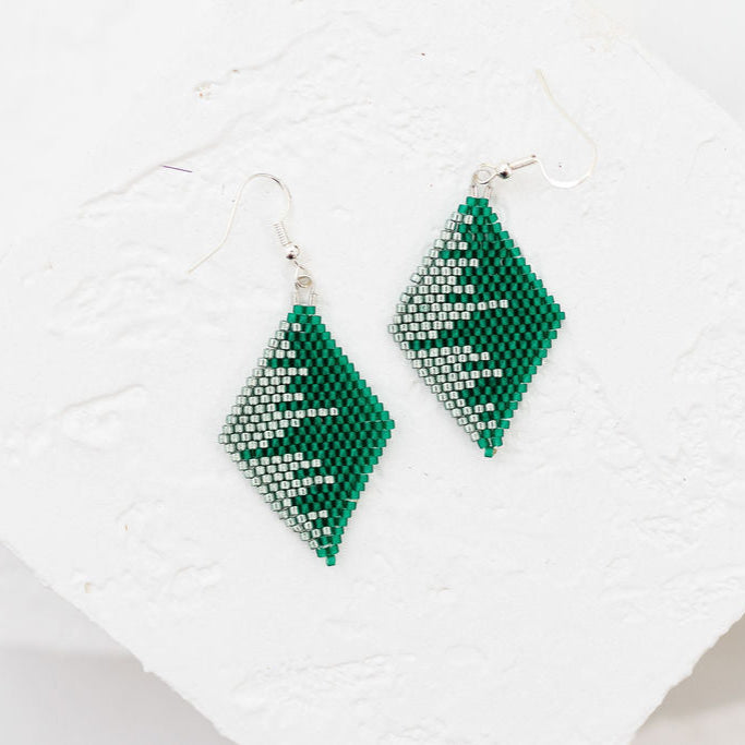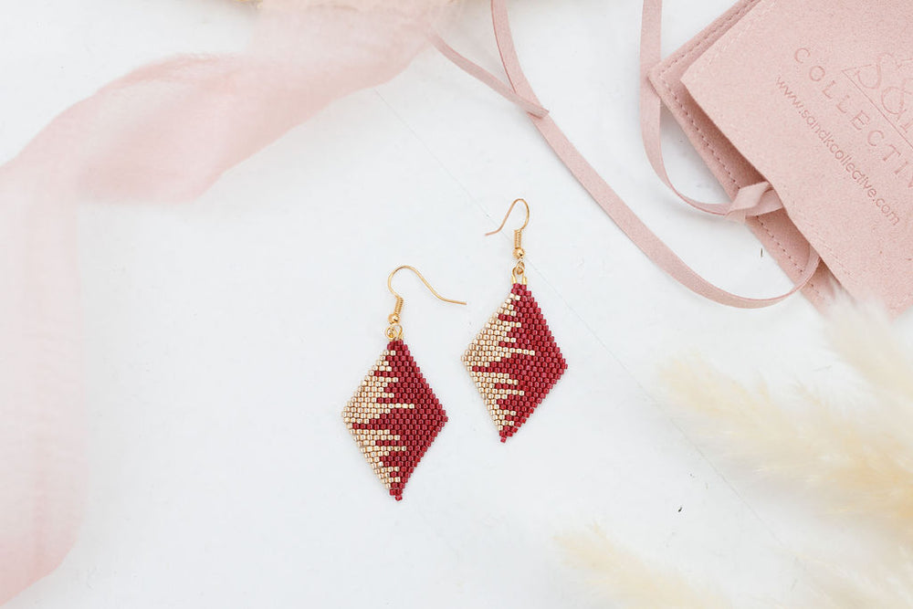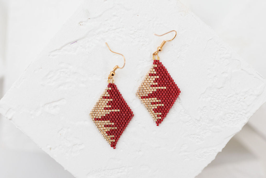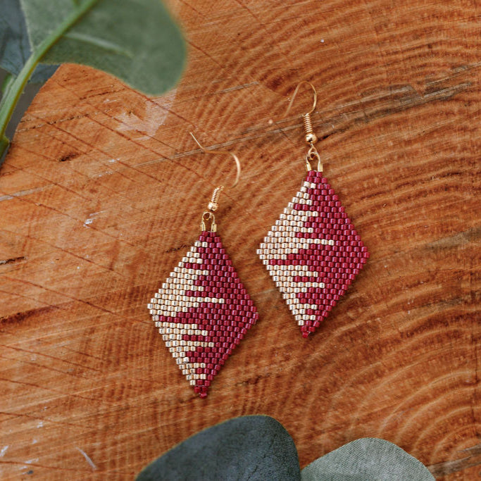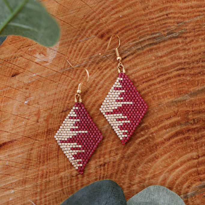 These handmade Indigenous diamond earrings combine traditional beadwork with a modern, luxe finish. Each pair is meticulously beaded with premium Miyuki Delica beads, accented with metallic tones for extra shine, and finished with 18K gold plated hardware. Lightweight yet bold, they’re designed to elevate any outfit.
