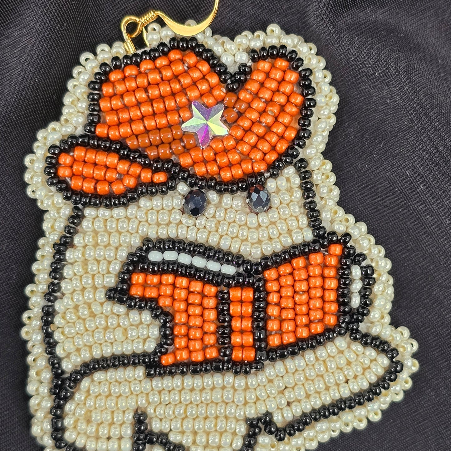 Each pair is crafted with meticulous beadwork in warm orange, ivory, and black glass seed beads, accented with a tiny star sparkle on the hat. Backed with soft faux leather and finished with stainless steel hooks for comfortable, hypoallergenic wear.